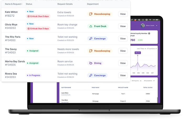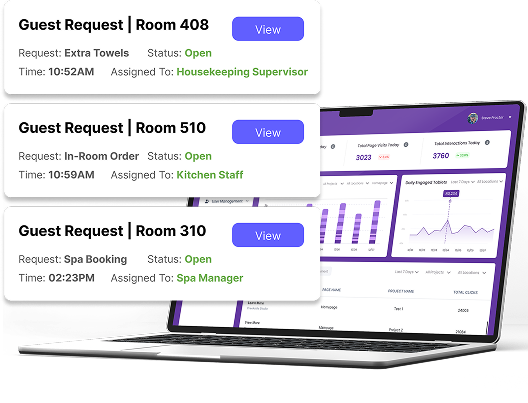 Service requests are routed directly to staff via smart ticketing. Guests get fast responses, while managers track performance and trends in real time.